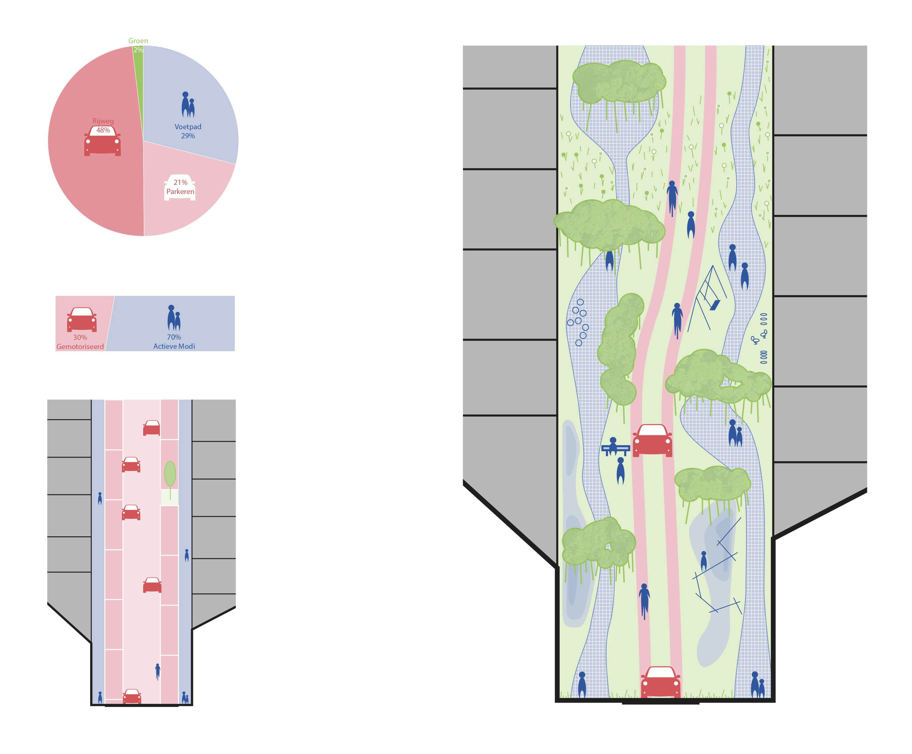 Vanuit deze vaststelling startte het ontwerp. Hoe zou de buurt de publieke ruimte gaan gebruiken als we de traditionele verhoudingen eens zouden omdraaien. De kleine rest-stukjes groen die vandaag 2% van de publieke ruimte invullen worden het uitgangspunt. We gaan maximaal voor groen en ontmoeting in de wijk. We geven de fietser en de voetganger de ruimte die ze verdienen. De auto wordt teruggedrongen naar de restruimtes. Op die manier kan de publieke ruimte een antwoord geven aan meerdere uitdagingen die zich in de wijk spelen. Verkoeling, ontmoeting, waterberging, … en ook voor lockdown-tijden wordt het veel eenvoudiger om afstanden te respecteren.